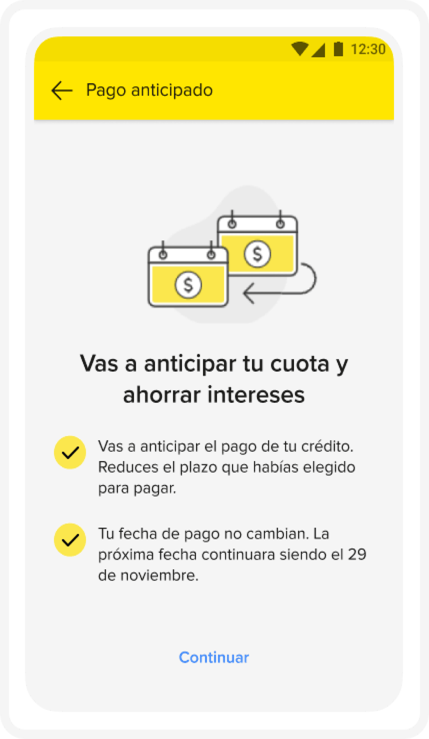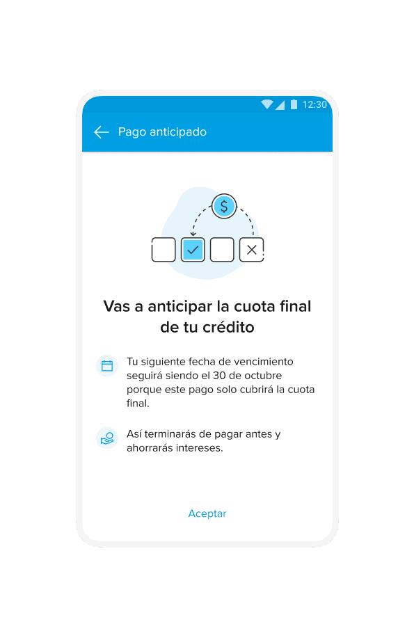 The interface exposes essentially one visible path for early payment, regardless of how the user actually wants to prepay. This makes it hard to compare options or decide which installments to advance, reinforcing the misconception that prepaying “skips a month” rather than recalculating amounts and dates.